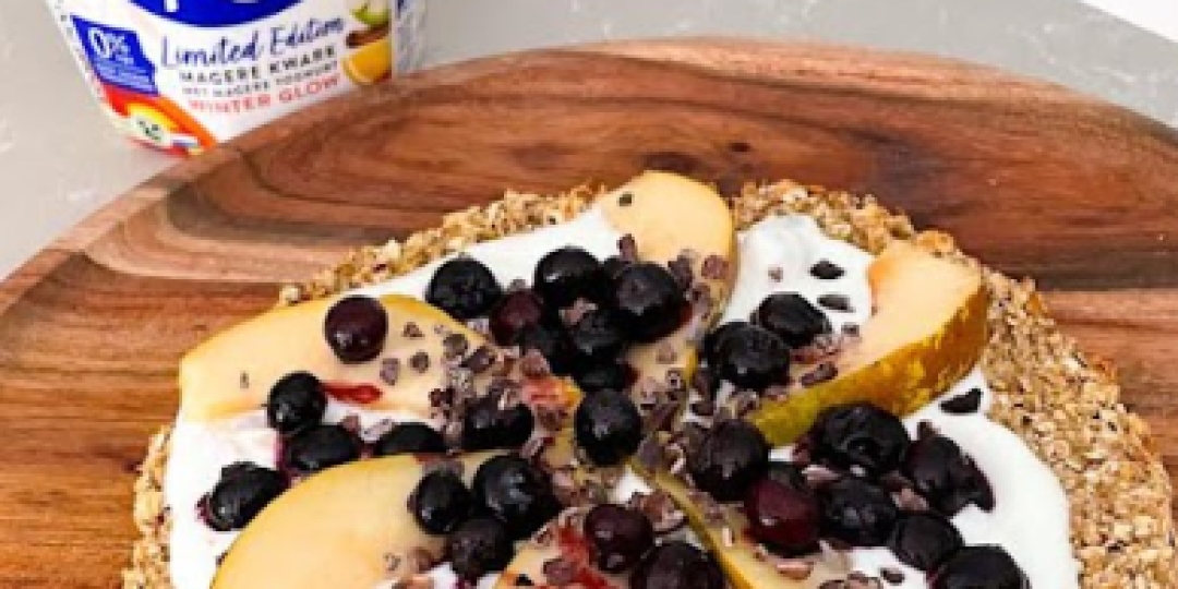 - Smeer de kwark op de pizza en beleg met vers fruit en toppings naar keuze.